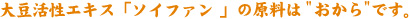 その硬い細胞壁(セルロース)を当社と大阪府立大学農学生命科学科との共同発明によるバイオテクノロジー技術(特許出願済)で溶かして抽出しました。 大豆活性エキス「ソイファン」とは、 分解されたセルロース(水溶性植物繊維)と中にある有効成分を一緒におからから抽出した大豆機能性成分なのです。 身体の内からも外からも有効な高機能成分です。